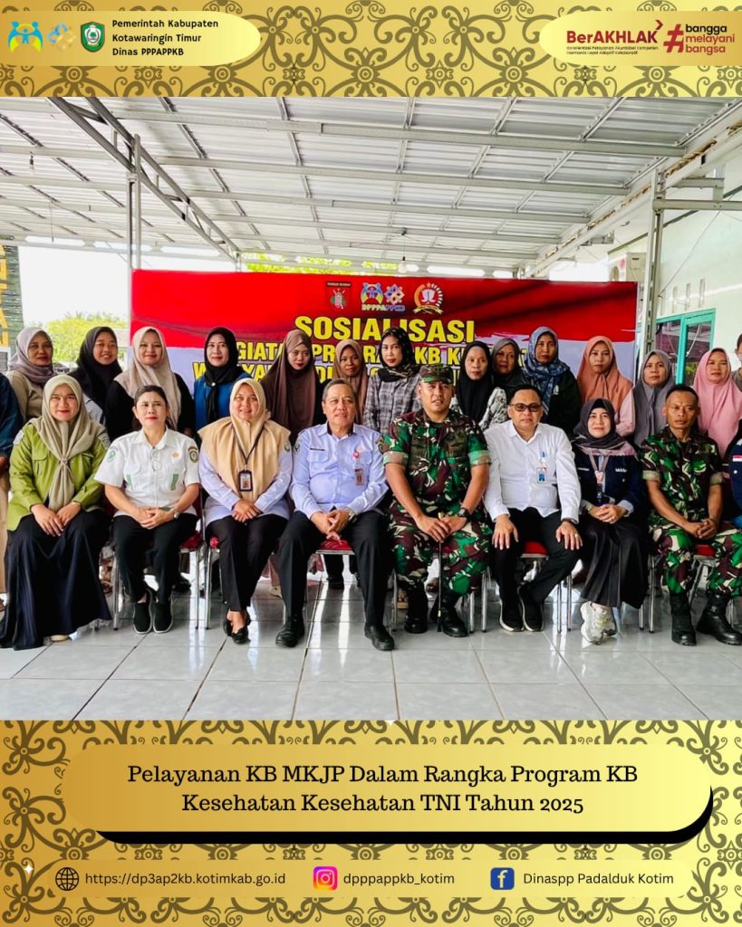 SAMPIT — Kodim 1015 Sampit bersama Dinas Pemberdayaan Perempuan, Perlindungan Anak, Pengendalian Penduduk dan Keluarga Berencana (PPPAPPKB) Kabupaten Kotawaringin Timur kembali menunjukkan sinergi nyata melalui kegiatan Pelayanan KB Kesehatan TNI (KB Kes TNI) yang dilaksanakan pada Rabu, 15 Oktober 2025, bertempat di Aula Kompi Senapan A Yonif 631/ATG, Sampit.